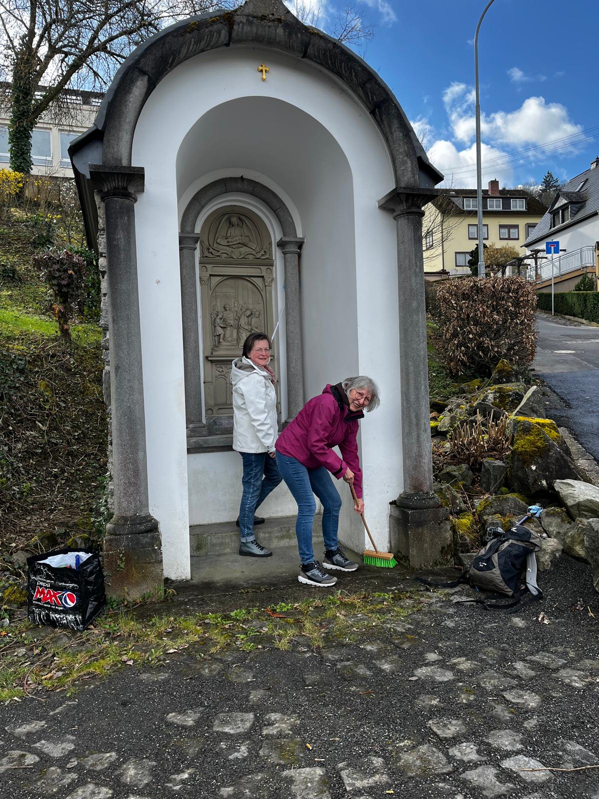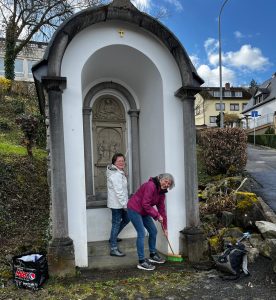 Alle Jahre wieder startet der VVV mit einen umfassenden Frühjahrsputz. Die Ruhebänke im Hamm und im Stadtwald werden gereinigt, und nach Bedarf frisch gestrichen und die Paten-Gräber des VVV auf dem Friedhof werden vor Ostern aufgehübscht. Ebenso werden die Stelen und Kapellchen am Stationenweg von Staub, Spinnweben und Unrat befreit damit sie sich beim Passionsgang hinauf zum Kreuzberg andachtswürdig zeigen können. Foto: Vera Kellner (rechts) und Monika Fisy beim Frühjahrsputz an Station VII.