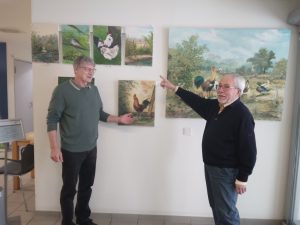 Der Organisator der Ausstellung, VVV-Vorsitzender Heinz Kähne (links) hört den Ausführungen des Malers Erich Best zu technischen Aspekten des Farbauftrags aufmerksam zu.